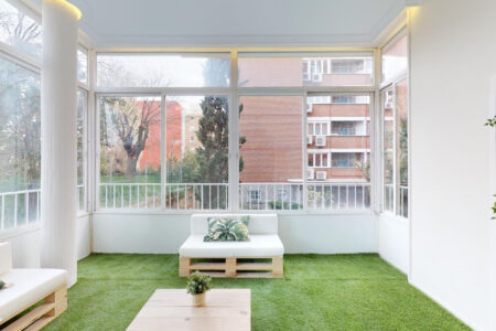 La terraza acristalada de gran amplitud añade un plus único al coliving: un espacio cubierto y luminoso, decorado con césped artificial, sofás y una mesa central, que invita a desconectar, trabajar en un ambiente tranquilo o disfrutar de un respiro sin salir de casa.