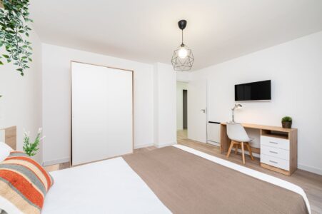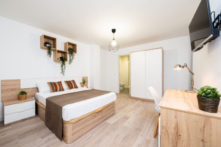 Coliving en Madrid Centro de amplias habitaciones y zonas comunes, ubicado en el barrio de Salamanca uno de los mejores puntos del centro de la ciudad. Cuenta con 6 habitaciones y un amplio estudio, perfecto para quienes buscan mayor privacidad. Tanto la habitación H5 como el estudio disponen de baño privado, mientras que el resto comparte tres baños completos.