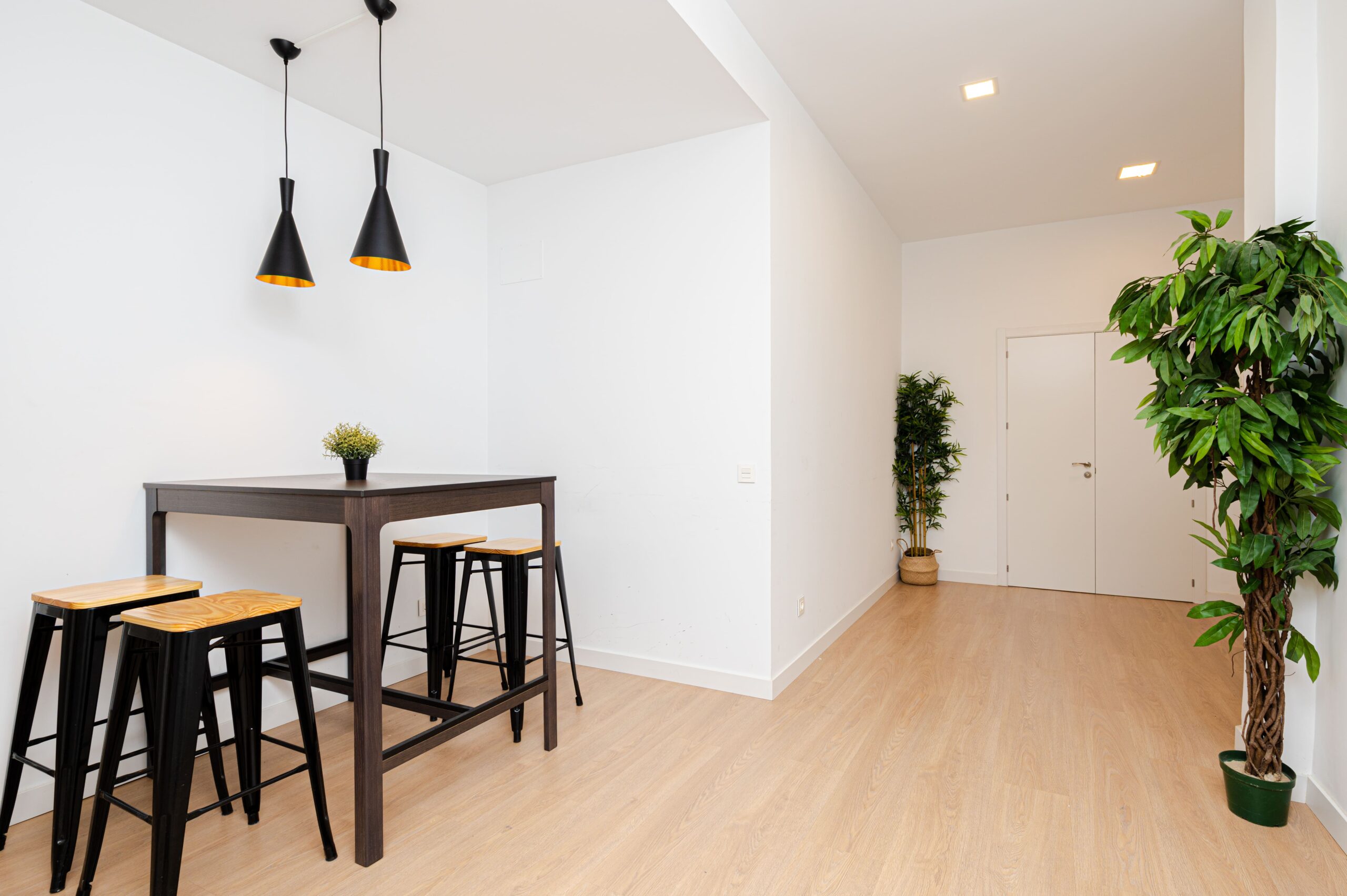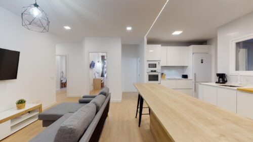 Su salón estilo lounge, con sofá cómodo, TV con streaming y zona de descanso, crea el espacio ideal para relajarse o convivir. Además, cuenta con una barra de comedor pensada para comer en compañía, lo que aporta un ambiente cercano y agradable. La cocina es amplia, moderna y completamente equipada, diseñada para facilitar el día a día incluso entre varios residentes.
