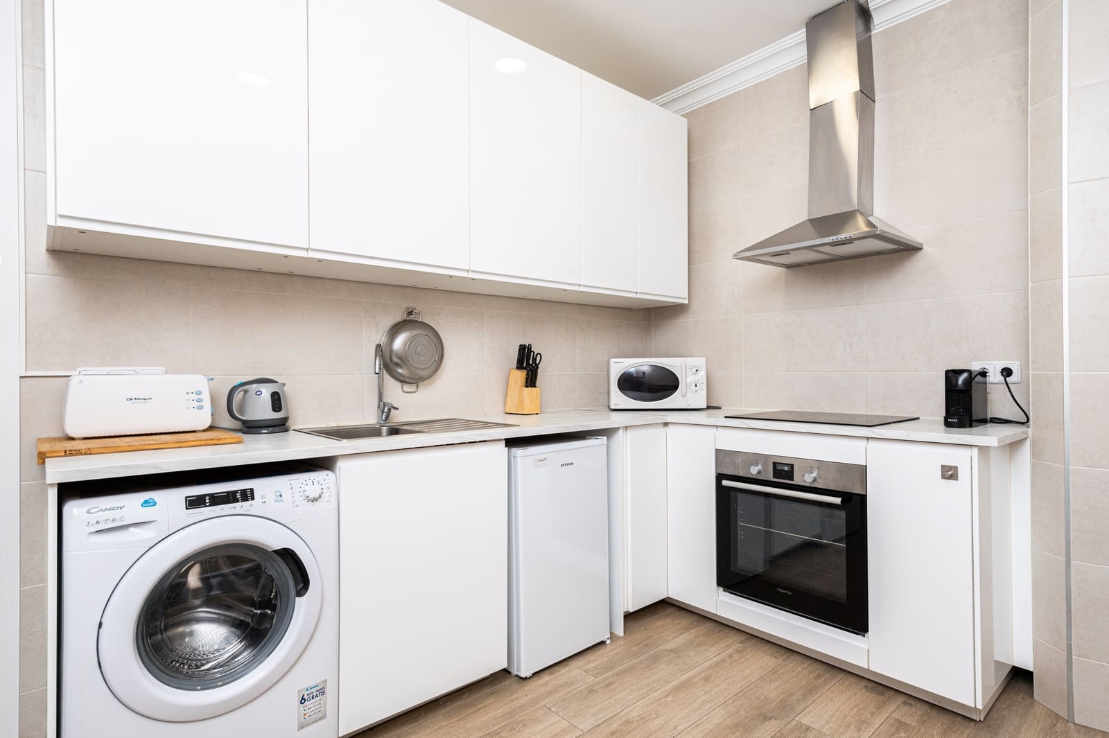 La cocina está completamente equipada: menaje, utensilios, sartenes, cafetera, copas, electrodomésticos y espacio de almacenaje optimizado para varios residentes.