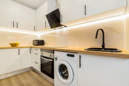 El comedor amplio se abre hacia una cocina moderna equipada, perfecta para el ritmo de quienes teletrabajan o estudian desde casa. Su diseño es práctico y fresco, con buena luz y suficiente espacio de almacenamiento para todos los residentes.