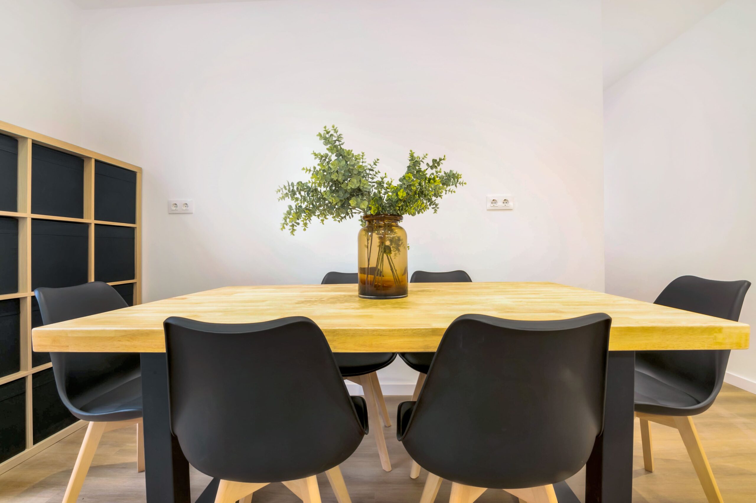 El comedor amplio se abre hacia una cocina moderna equipada, perfecta para el ritmo de quienes teletrabajan o estudian desde casa. Su diseño es práctico y fresco, con buena luz y suficiente espacio de almacenamiento para todos los residentes.